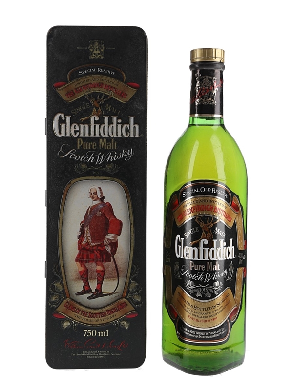A bottle of Glenfiddich Special Old Reserve Pure Single Malt Scotch Whisky produced by William Grant & Sons Ltd. and presented in a Clans of the Highlands of Scotland tin. We estimate this was bottled in the 1980s.