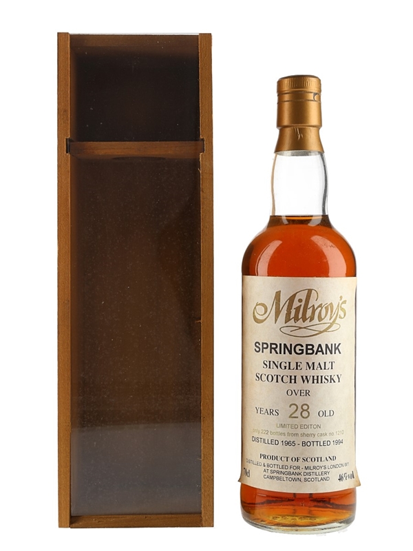 A bottle of Springbank 28 Year Old Campbletown Single Malt Scotch Whisky. This was distilled in 1965, matured in a single sherry cask, and bottled at 46% ABV in 1994 for Milroy's of Soho. This is one of 222 bottles; it was bottled from cask number 1210.