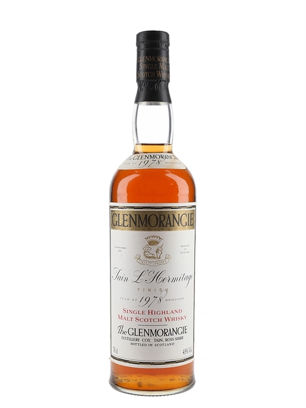 A rare 1978 vintage Glenmorangie Single Highland Malt Scotch Whisky, using whisky matured for 12 years in American white oak and later aged for a further five years in red-wine barrels from the Tain L'Hermitage commune in France's Rhône Valley – one of the country's most famous wine regions.