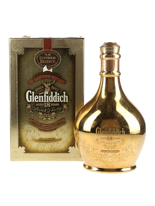 A bottle of Glenfiddich 18 Year Old Superior Reserve Single Malt Scotch Whisky, presented in a ceramic decanter decorated in 23 carat gold.