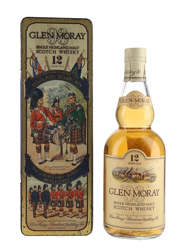 A bottle of Glen Moray 12 Year Old Single Highland Malt Scotch Whisky in a Scotland's Historic Highland Regiments tin. This tin depicts The Argyll and Sutherland Highlanders. We estimate this was bottled in the 1980s.