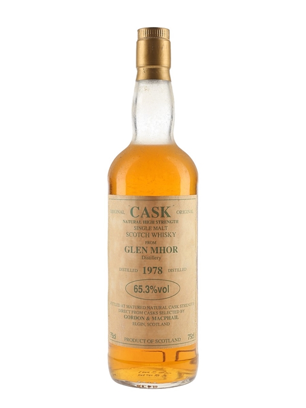 A bottle of Glen Mhor 1978 Original Cask Natural High Strength Single Malt Scotch Whisky, bottled at 65.3% ABV by independent bottler Gordon & MacPhail. We estimate this was bottled in the 1980s.