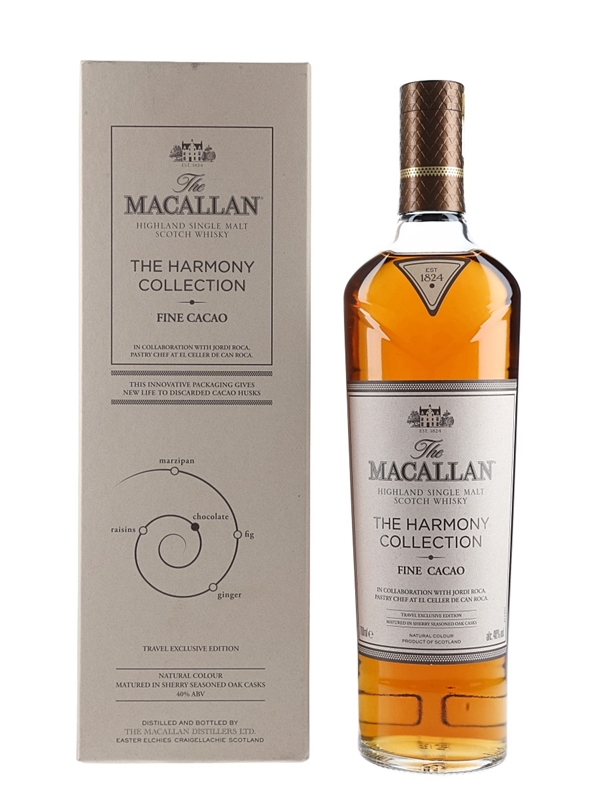 A bottle of The Macallan Fine Cacao Highland Single Malt Scotch Whisky from The Harmony Collection. This is inspired by the chocolate creations of Spanish chef Jordi Roca, pastry chef at El Celler de Can Roca. The restaurant was twice voted best restaurant in the world.