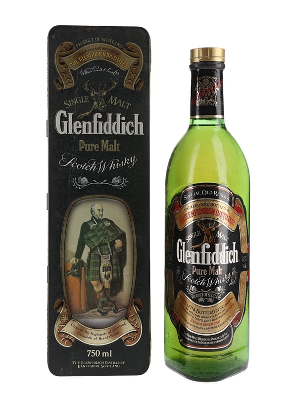 A bottle of Glenfiddich Special Reserve in a Clans of the Highlands of Scotland presentation tin. We estimate this was bottled in the 1980s.