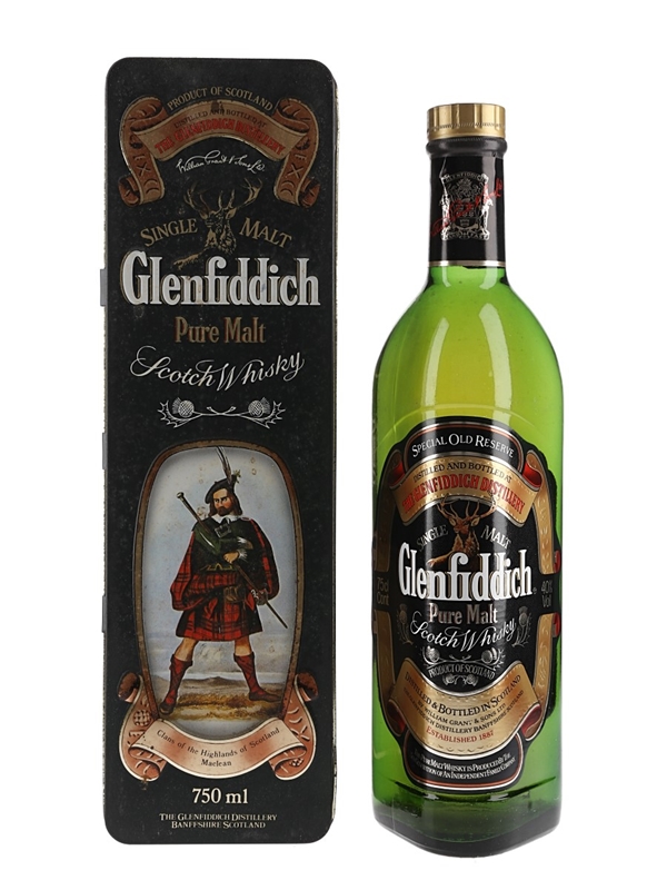 A bottle of Glenfiddich Special Reserve in a Clans of the Highlands of Scotland presentation tin. We estimate this was bottled in the 1980s.