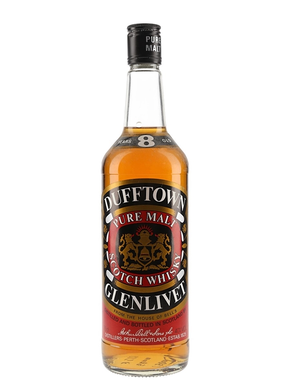 A bottle of Dufftown Glenlivet 8 Year Old Pure Malt Scotch Whisky from the House of Bells. We estimate this was bottled in the 1980s.