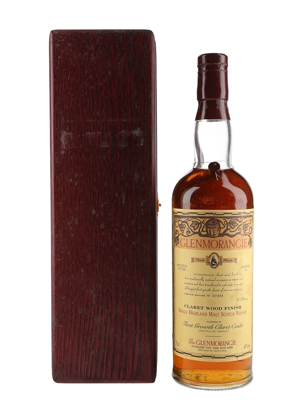A bottle of Glenmorangie Claret Wood Finish Single Highland Malt Scotch Whisky. In 1989, the distillery selected eight American white oak barrels of vintage Glenmorangie, distilled between 1976 and 1979, and transferred the whisky to casks which previously held First Growth wine from Pauillac, Bordeaux. This is bottle number 001854.