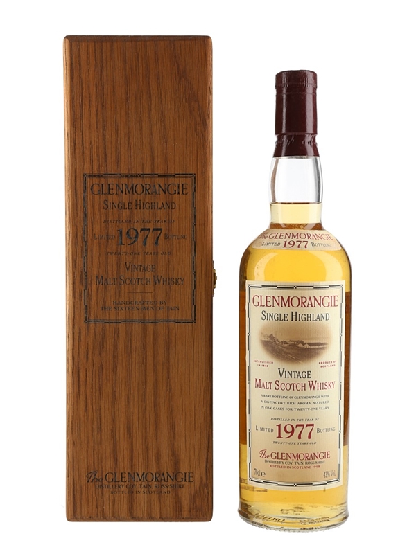 A limited edition bottle of Glenmorangie Vintage 1977 Single Highland Malt Scotch Whisky, matured in American oak barrels for 21 years.