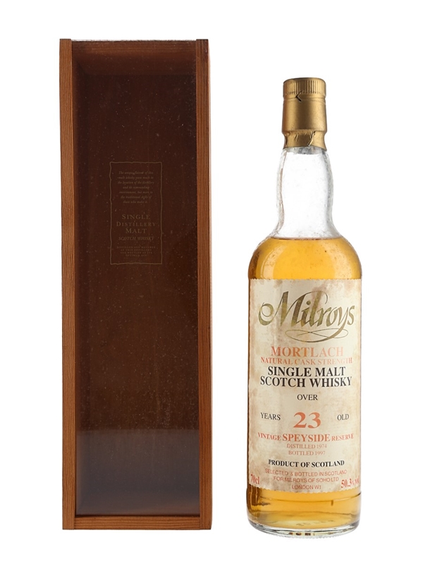 A bottle of Mortlach 23 Year Old Speyside Single Malt Scotch Whisky. This was distilled in 1974 and bottled in 1997 at a cask strength of 50.3% ABV for Milroy's of Soho.