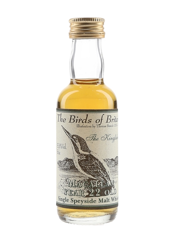 A miniature bottle of Macallan 22 Year Old Single Speyside Malt Whisky, distilled and bottled in Scotland by Arthur J A Bell for The Whisky Connoisseur's Birds Of Britain Collection. The labels were illustrated by Thomas Bewick (1753-1828).