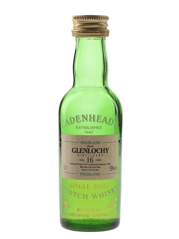 A miniature bottle of Glenlochy 16 Year Old Single Malt Scotch Whisky. This was distilled in October 1977 and bottled in February 1994 by Cadenhead's at a cask strength of 59% ABV.
