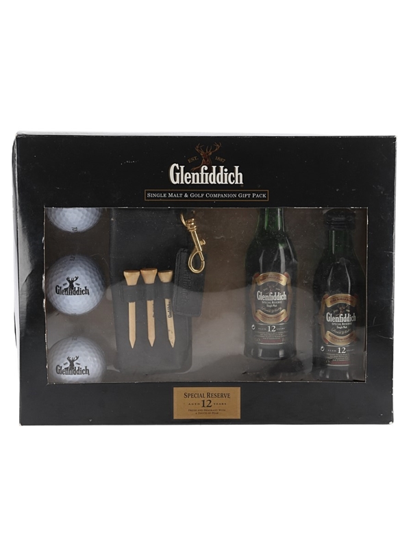 This lot contains two miniature bottles of Glenfiddich 12 Year Old Special Reserve Single Malt Scotch Whisky in a presentation box with a Glenfiddich leather golf ball bag, three top flite golf balls and three wooden golf tees.