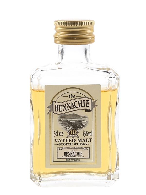 A miniature bottle of The Bennachie 10 Year Old Vatted Malt Scotch Whisky.