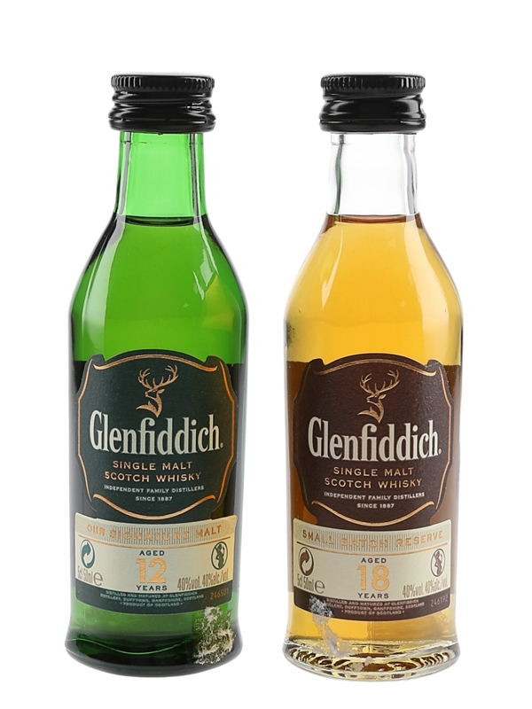 This lot contains two miniature bottles of Single Malt Scotch Whisky, including Glenfiddich 12 Year Old and Glenfiddich Small Batch Release 18 Year Old.