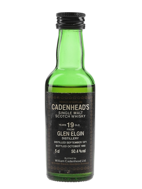 A miniature bottle of Glen Elgin 19 Year Old Single Malt Scotch Whisky. This was distilled in September 1971 and bottled at cask strength of 50.4% ABV in October 1990 by Cadenhead's.