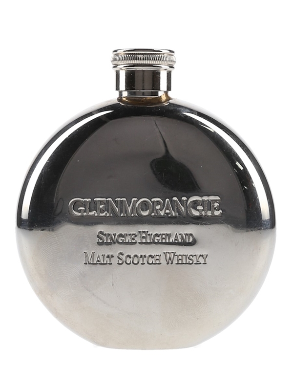 A branded stainless steel Glenmorangie Single Highland Malt Scotch Whisky hip flask.