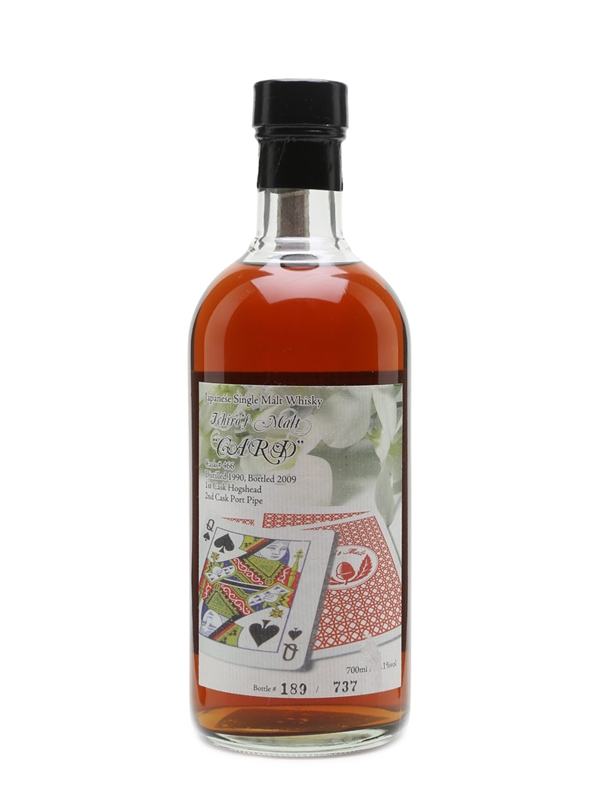 A bottle of Ichiro's Malt Queen of Spades, a 1990 vintage whisky from the now-closed Hanyu distillery. This was bottled in 2009 for the Card series after maturing in two different cask types - a hogshead and a port pipe.