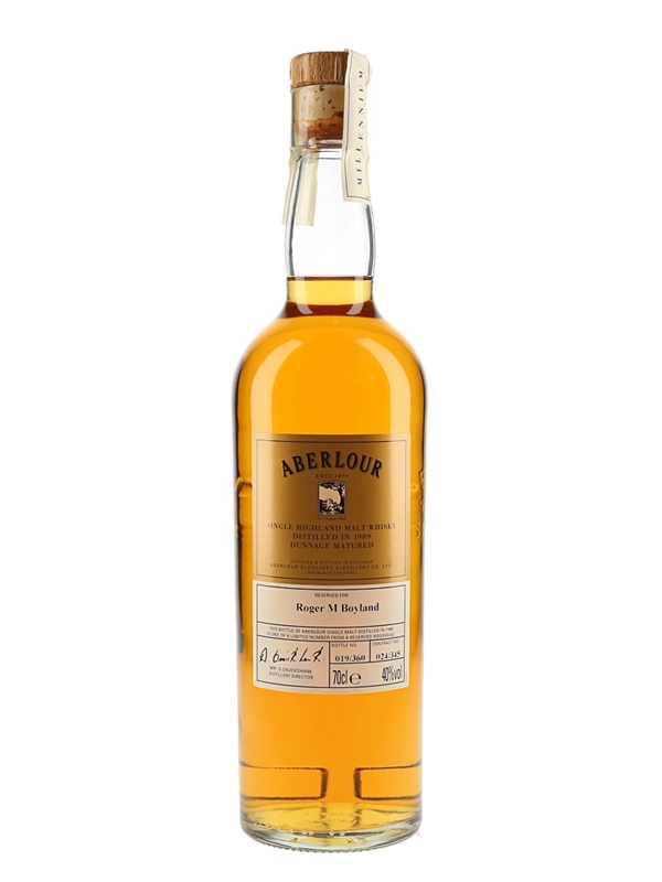 A bottle of Aberlour 1989 Single Highland Malt Scotch Whisky, bottled to celebrate the new millennium.