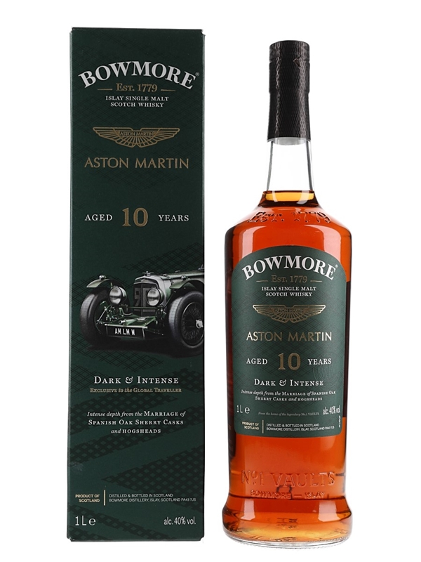 A litre bottle of Bowmore 10 Year Old Islay Single Malt Scotch Whisky, edition number one in the distilley's collaboration with Aston Martin. This was matured in a combination of Spanish oak sherry and hogshead casks.