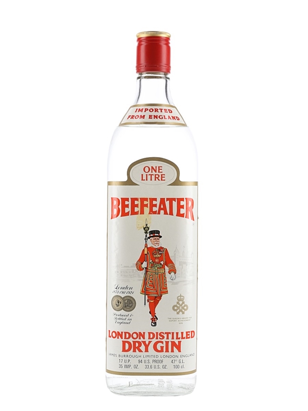 A litre bottle of Beefeater London Distilled Dry Gin produced by James Burrough Limited. This was bottled for the Hills Duty Free market, we estimate in the late 1970s to early 1980s.