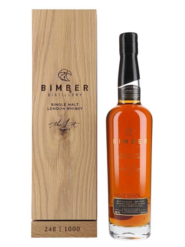 A bottle of The 1st Release of Single Malt London Whisky from Bimber Distillery. This was bottled from five first-fill ex-Pedro Ximenez sherry casks filled in 2016, which were previously used in a Jerez solera for several decades. This was bottled at 54.2% ABV in 2019.