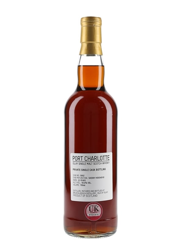 A private cask bottling of Port Charlotte 15 Year Old Islay Single Malt Scotch Whisky, matured in a single sherry hogshead and bottled at 60.6% ABV.