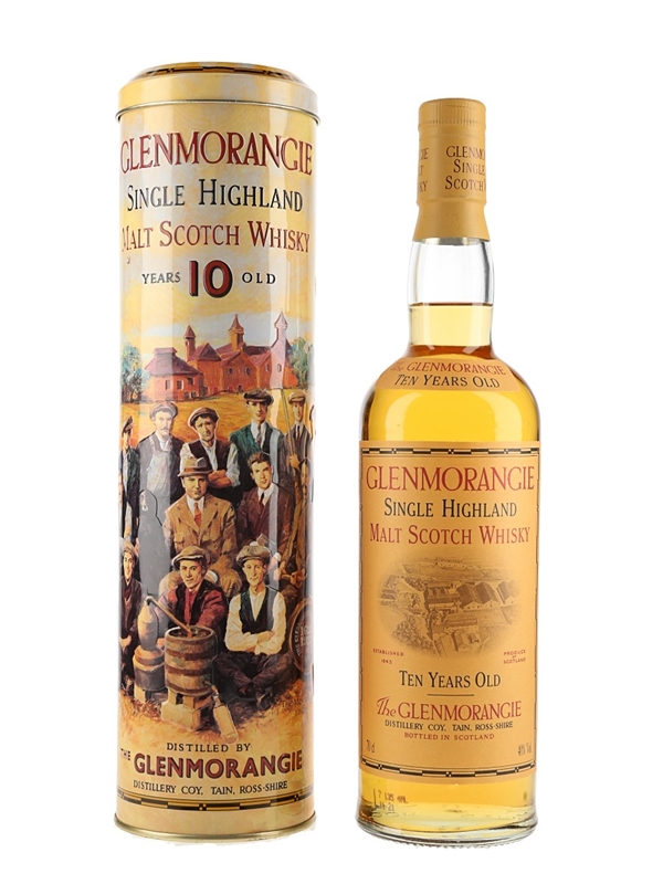A bottle of Glenmorangie 10 Year Old Single Highland Malt Scotch Whisky. The tin is embossed with an image of the 16 Men of Tain, the makers of Glenmorangie. We estimate this was bottled in the 1990s.