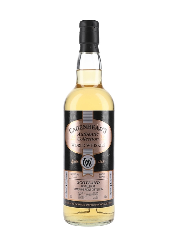 A bottle of Cameronbridge 11 Year Old Individual Cask Single Grain Scotch Whisky. This was matured in a bourbon hogshead and bottled at 64% ABV in May 2000 by Cadenhead's as a part of the Authentic Collection.