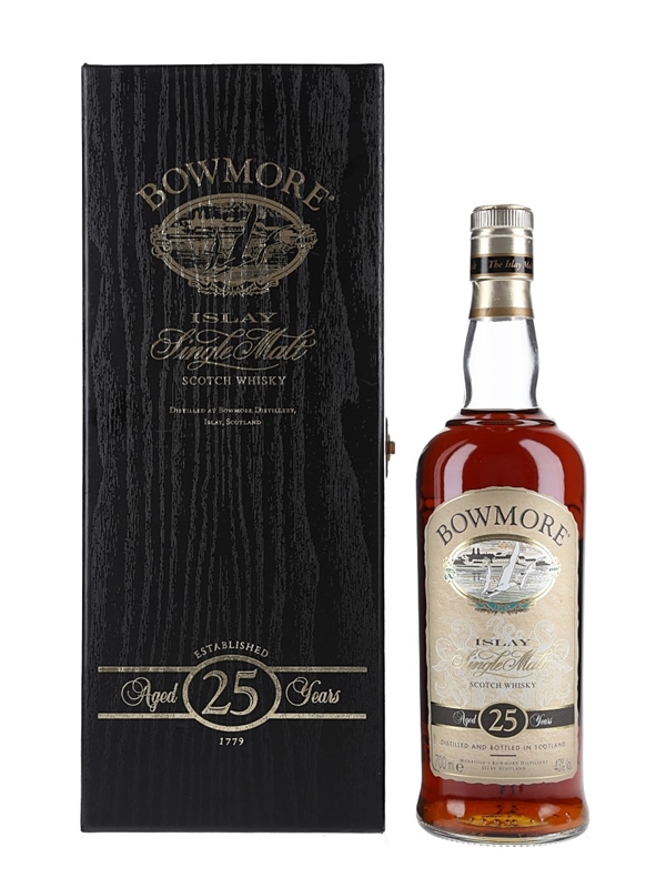 A bottle of Bowmore 25 Year Old Single Malt Scotch Whisky. This presentation was available from 2004 and is now discontinued.