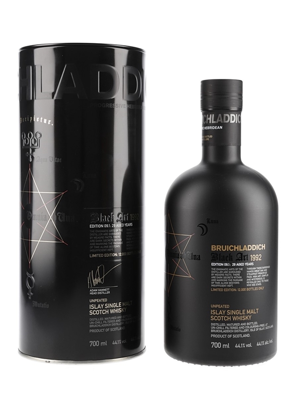 A limited edition bottle of the ninth edition of Bruichladdich's 29 Year Old Islay Single Malt Scotch Whisky Black Art series. The whisky was created by Master Distiller Jim McEwan and the exact composition is kept a secret. This was distilled in 1992 and bottled in 2021.