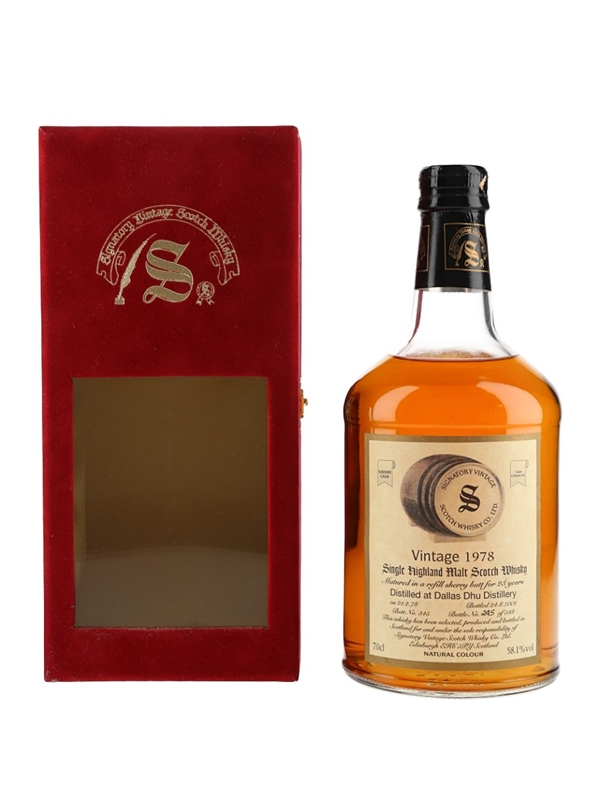 A bottle of Dallas Dhu 1978 Single Highland Malt Scotch Whisky. This was matured in a refill butt for 23 years before being bottled at 58.1% ABV by Signatory Vintage, on 24 August 2001.