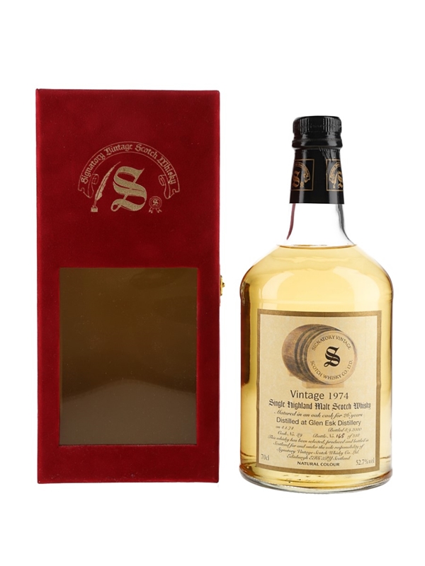 A bottle of Glen Esk 1974 Single Highland Malt Scotch Whisky. This was matured in an oak cask for 26 years before being bottled at 52.7% ABV by Signatory Vintage, on 8 September 2000.