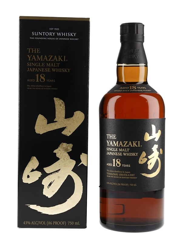 A bottle of The Yamazaki 18 Year Old Japanese whisky produced in Japan and bottled at 43% ABV. This was imported to the US market by Beam Suntory.