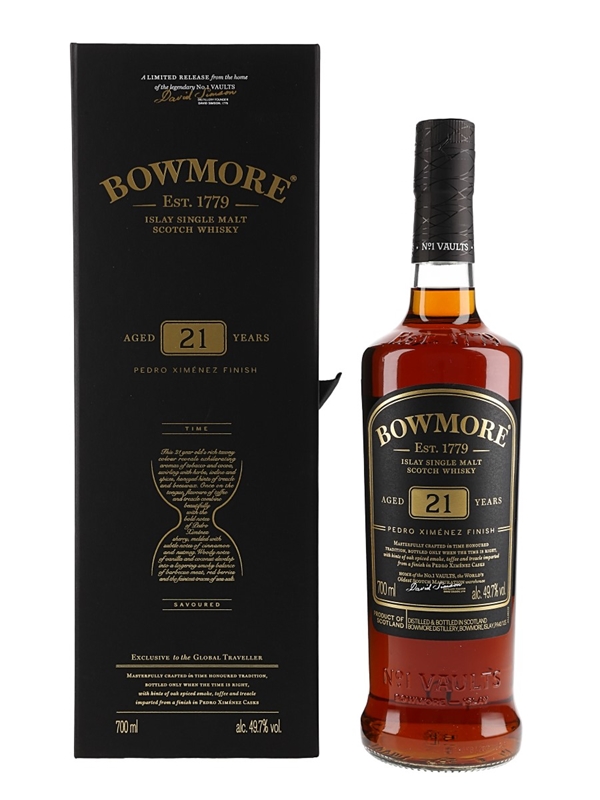 A limited edition bottle of Bowmore 21 Year Old Islay Single Malt Scotch Whisky. This was finished in Pedro Ximenez casks and bottled at 49.7% ABV for global travel retail.