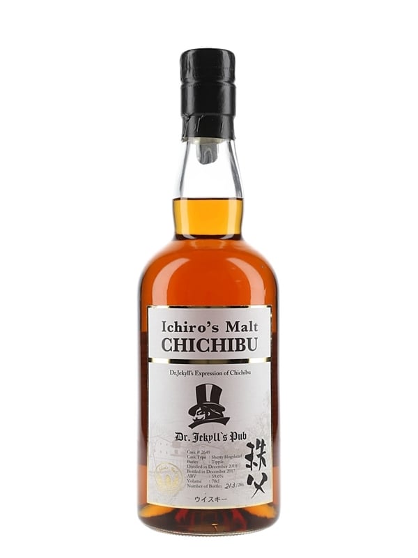 A bottle of Ichiro's Malt Chichibu 2010 Single Malt Whisky from Japan, bottled for Dr. Jekyll’s Pub, Oslo. This was distilled in December 2010, matured in a single sherry hogshead and bottled in December 2017.
