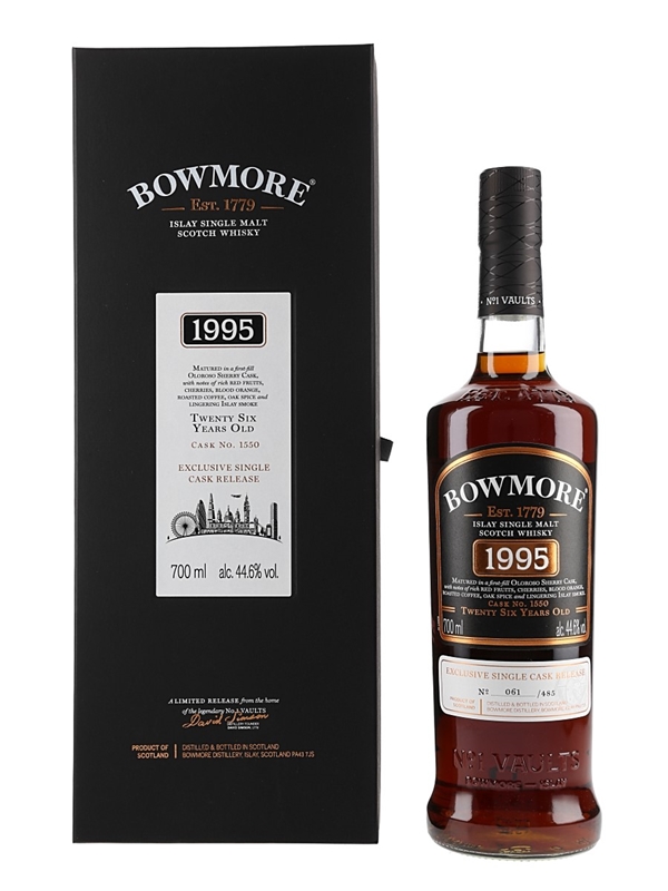A bottle of Bowmore 26 Year Old Islay Single Malt Scotch Whisky bottled for the single cask release. This was distilled in 1995 from cask number 1550 and matured in a first fill Oloroso Sherry.