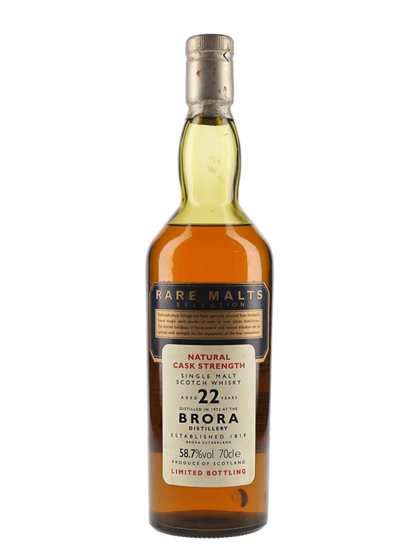 A limited edition bottle of Brora 22 Year Old Natural Cask Strength Single Malt Scotch Whisky. This was distilled in 1972 and bottled at a cask strength of 58.7% ABV for Diageo's now-discontinued Rare Malts Selection range.