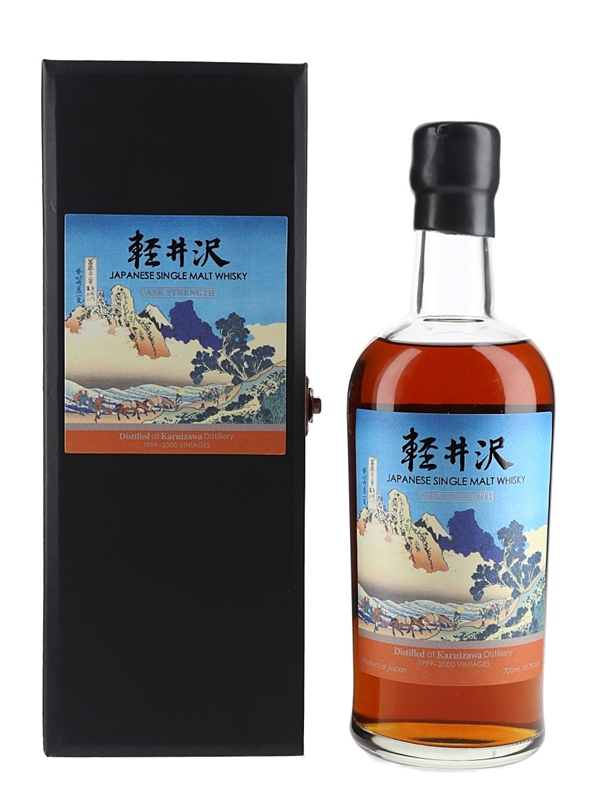 A bottle of Karuizawa from the 36 Views of Mount Fuji series. Each bottle in this series was produced from Karuizawa's final two vintages, 1999 and 2000, and are bottled at cask strength. The labels feature artwork by Japanese ukiyo-e artist Hokusai, depicting Mount Fuji from different aspects.