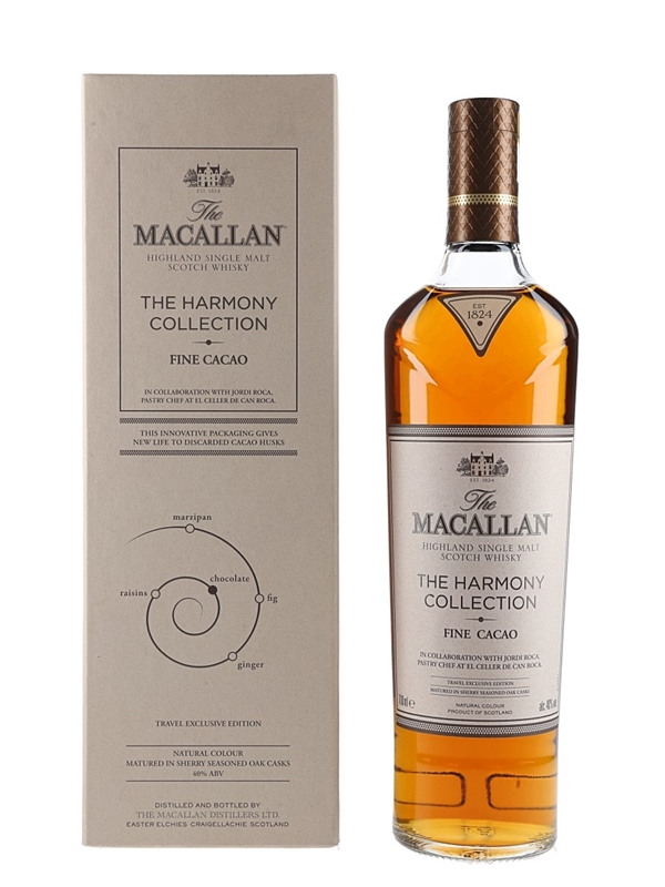 A bottle of The Macallan Fine Cacao Highland Single Malt Scotch Whisky from The Harmony Collection. This is inspired by the chocolate creations of Spanish chef Jordi Roca, pastry chef at El Celler de Can Roca. The restaurant was twice voted best restaurant in the world.
