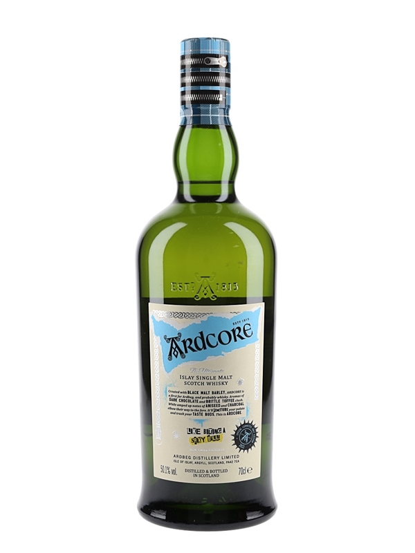 A bottle of Ardbeg Ardcore Islay Single Malt Scotch Whisky, made with black malt barley and bottled at a cask strength of 50.1% ABV.