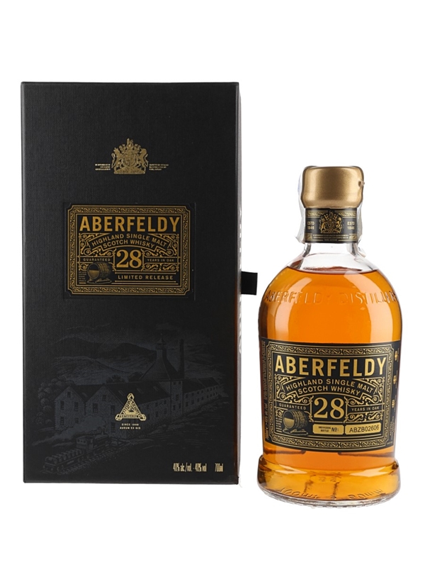 A limited release bottle of Aberfeldy 28 Year Old Single Malt Scotch Whisky.