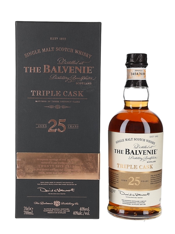 A bottle of The Balvenie 25 Year Old Triple Cask, matured in a combination of olosoro sherry, first fill bourbon and traditional whisky casks.