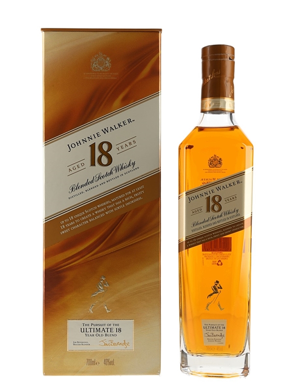 A bottle of Johnnie Walker 18 Year Old blended Scotch whisky, bottled for the travel retail market. This expression replaced the Platinum Label, which has now been discontinued.