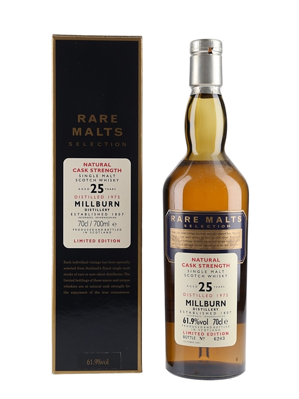 A limited edition bottle of Millburn 25 Year Old Single Malt Scotch Whisky. This was distilled in 1975 and bottled in October 2001 for Diageo's now-discontinued Rare Malts Selection.
