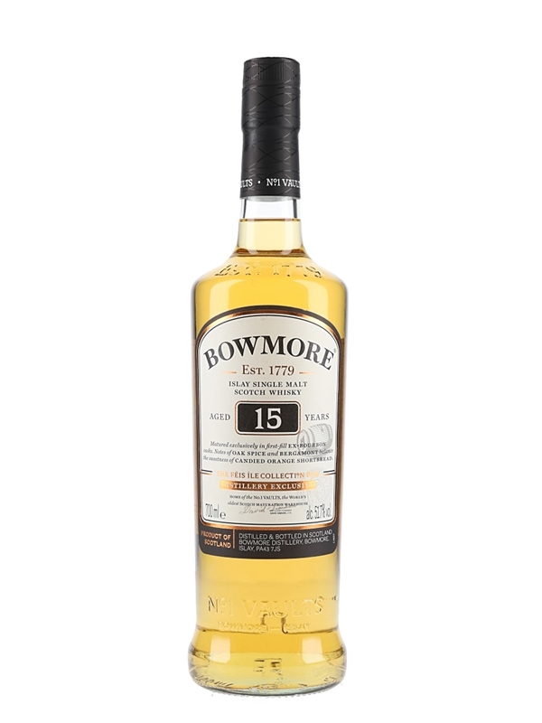 A bottle of Bowmore 15 Year Old Islay Single Malt Scotch Whisky released for Feis Ile 2019 and only available from the distillery. This was matured in first fill bourbon casks and bottled at a cask strength of 51.7% ABV.