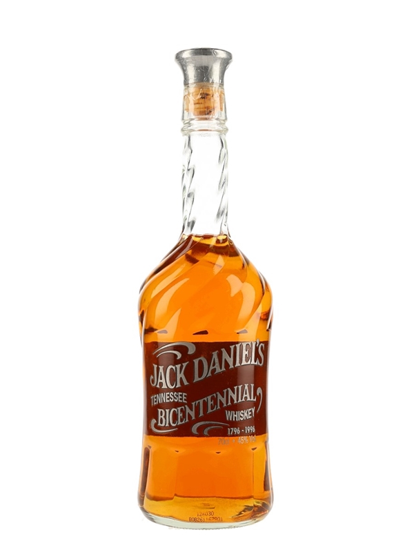 A bottle of Jack Daniel's Bicentennial Tennessee Whiskey, bottled at 45% ABV in 1996 to celebrate the 200th anniversary of the state of Tennessee. The bottle is a replica of the one designed by Mr Daniel himself to celebrate the 100th anniversary of the state in 1896.