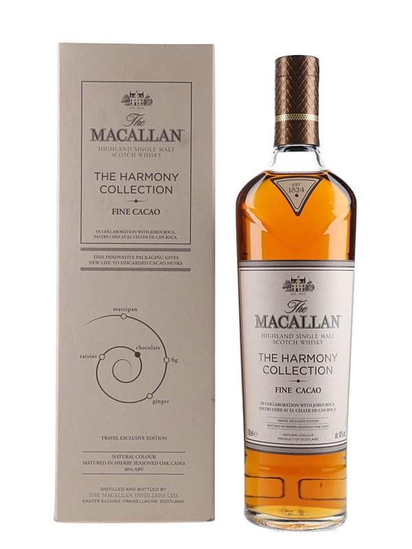 A bottle of The Macallan Fine Cacao Highland Single Malt Scotch Whisky from The Harmony Collection. This is inspired by the chocolate creations of Spanish chef Jordi Roca, pastry chef at El Celler de Can Roca. The restaurant was twice voted best restaurant in the world.