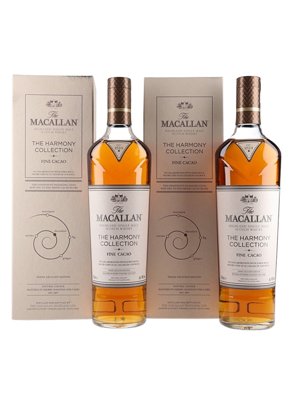 This lot contains two bottles of The Macallan Fine Cacao Highland Single Malt Scotch Whisky from The Harmony Collection. This is inspired by the chocolate creations of Spanish chef Jordi Roca, pastry chef at El Celler de Can Roca. The restaurant was twice voted best restaurant in the world.