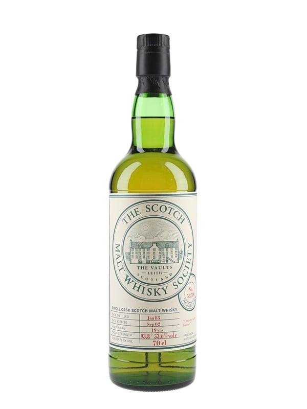 A bottle of Caol Ila 19 Year Old Single Malt Scotch Whisky from the Scotch Malt Whisky Society. This was distilled in January 1983, matured for 19 years and bottled in September 2002 at 53.6% ABV.