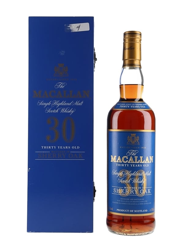 A bottle of The Macallan 30 Year Old Single Highland Malt Scotch Whisky, matured in sherry casks. This was the last edition of the 30 year old to be released before the introduction of the Fine Oak series.